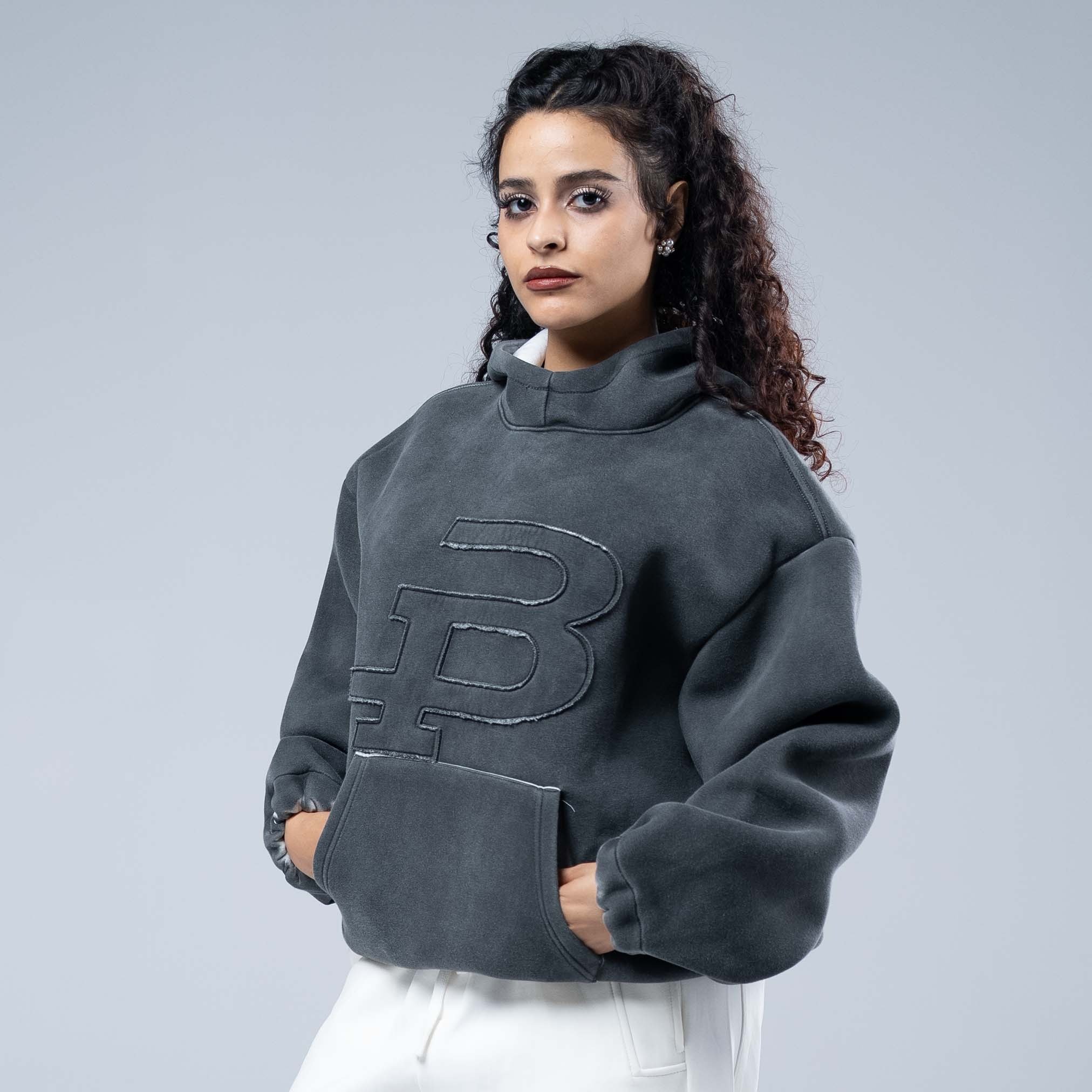 هودي اوفرسايز بكاب تطريز حرف بارز بجيوب - رمادي غامق