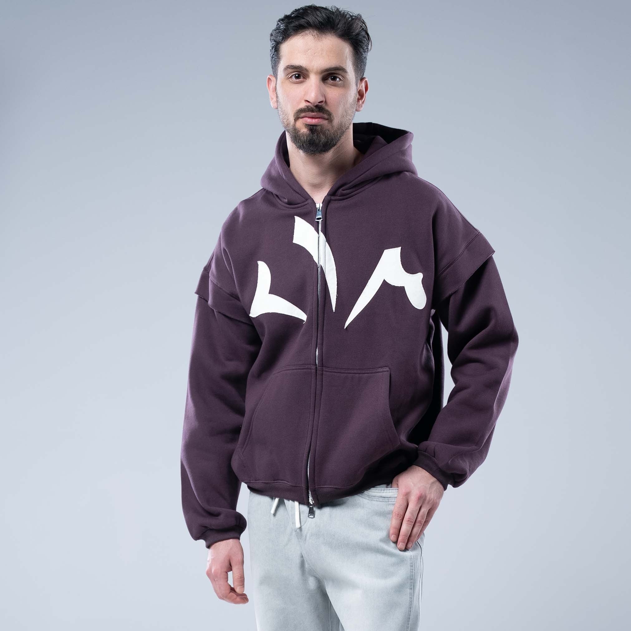 هودي واسع بكاب بسحاب وتطريز مزخرف على الأكمام - اسود