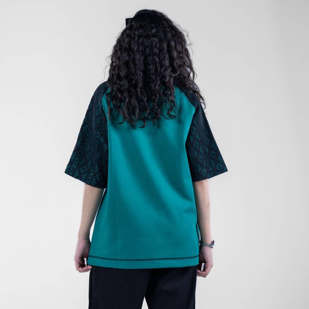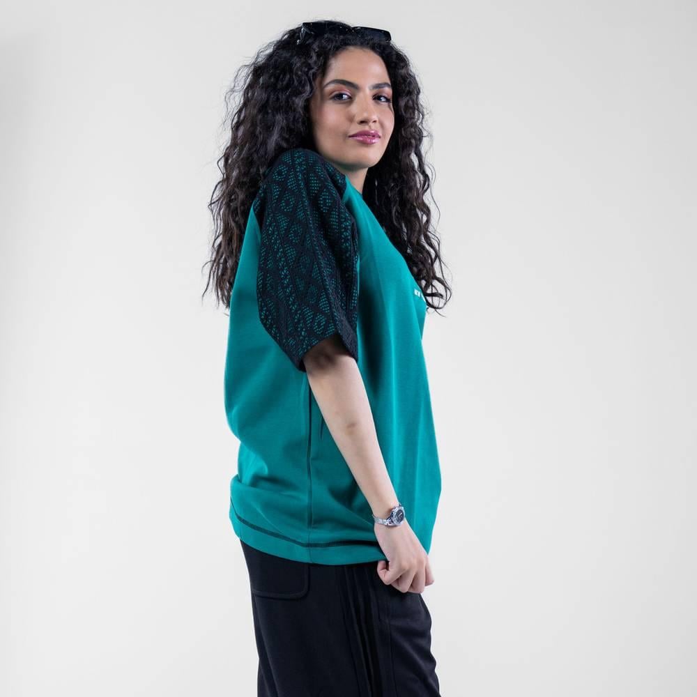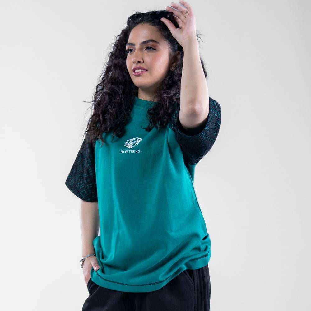 تيشيرت اوفرسايز خامه طبية منقوشة بتصميم شبكي هندسي أنيق - اخضر