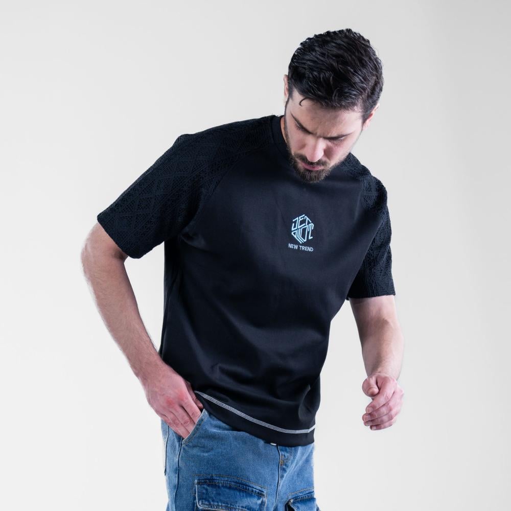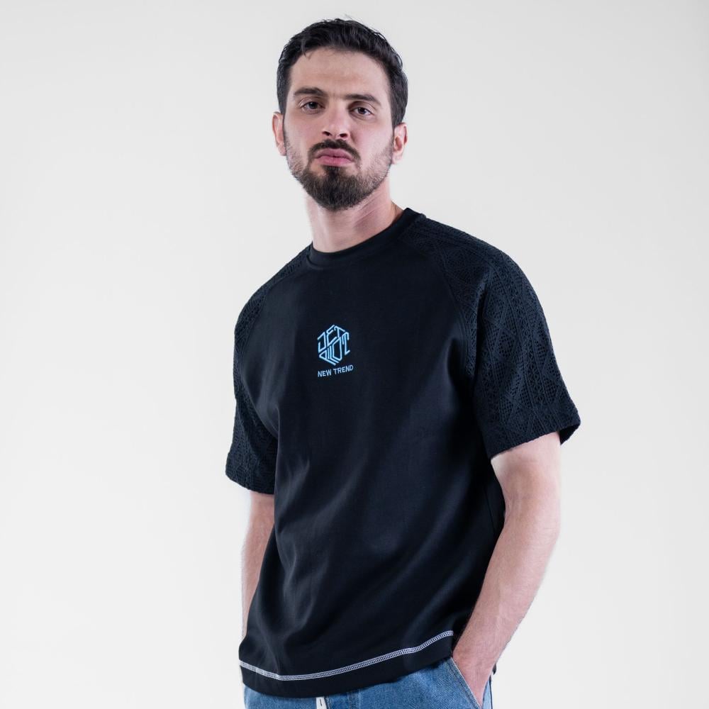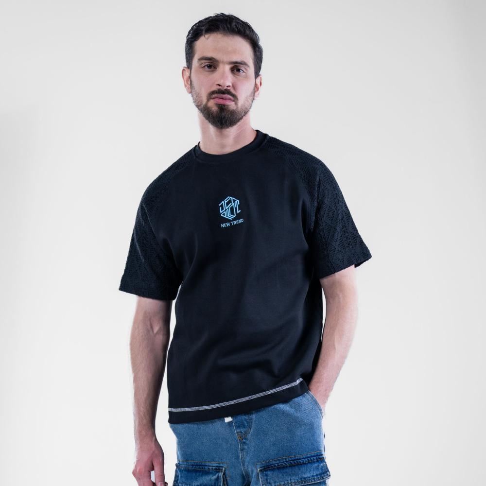 تيشيرت اوفرسايز خامه طبية منقوشة بتصميم شبكي هندسي أنيق - اسود