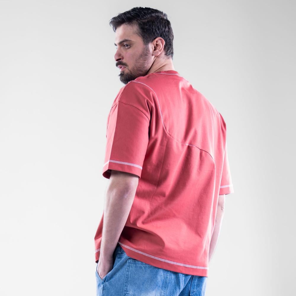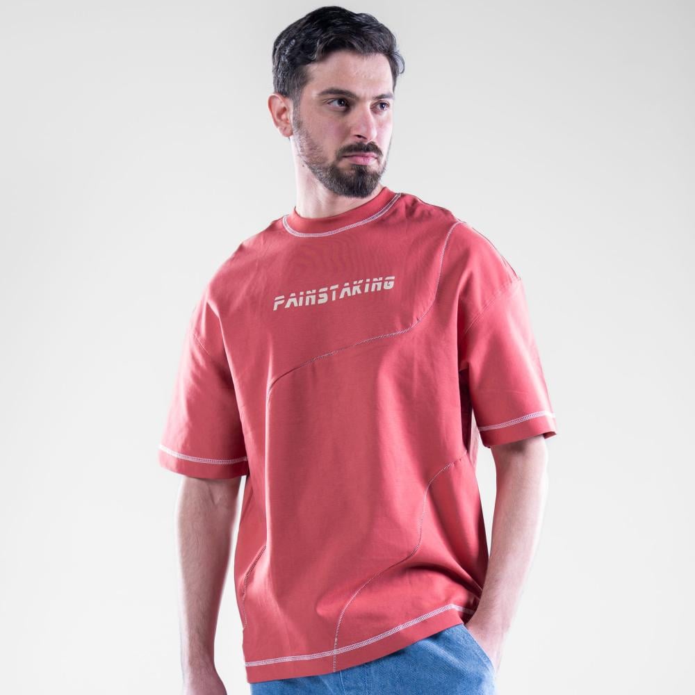 تيشيرت اوفرسايز بطبعه امامية صغيرة وخطوط انسيابية - احمر غامق
