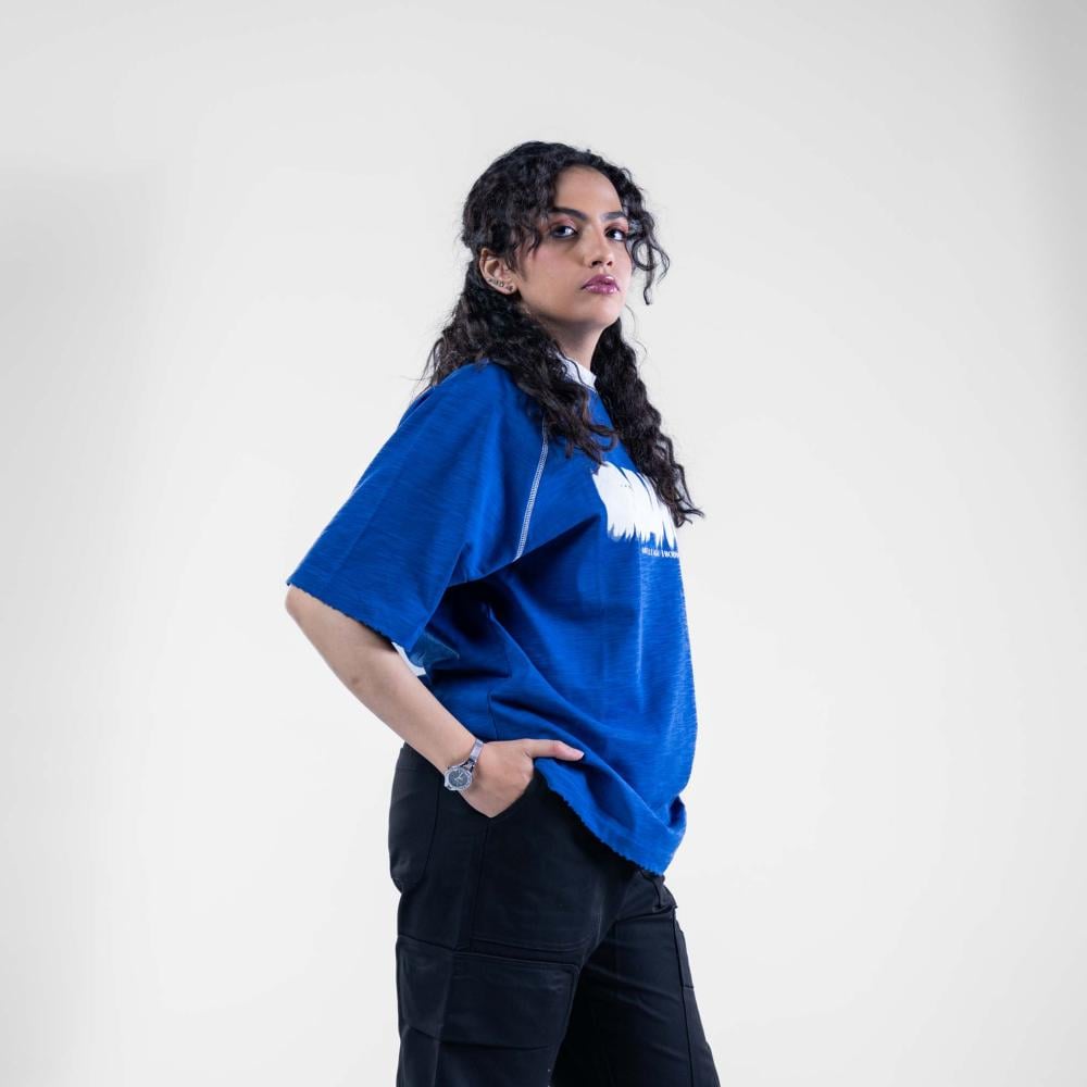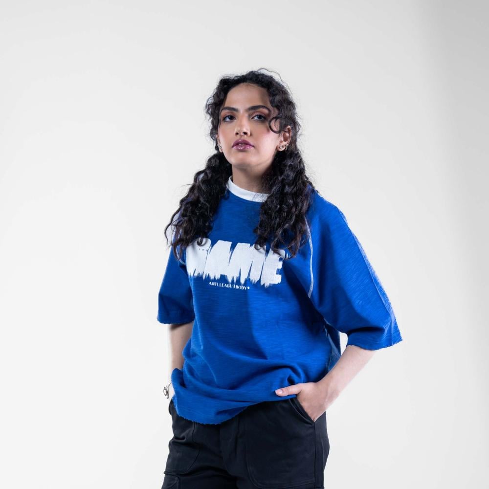 تيشيرت قطن اوفرسايز بطبعة امامية GAME - ازرق