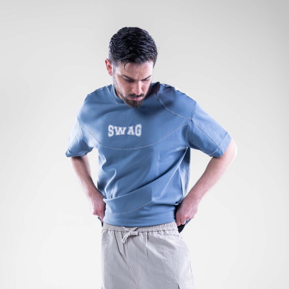 تيشيرت قطن مريح متعدد الألوان بطباعة SWAG وخياطة بارزة - ازرق