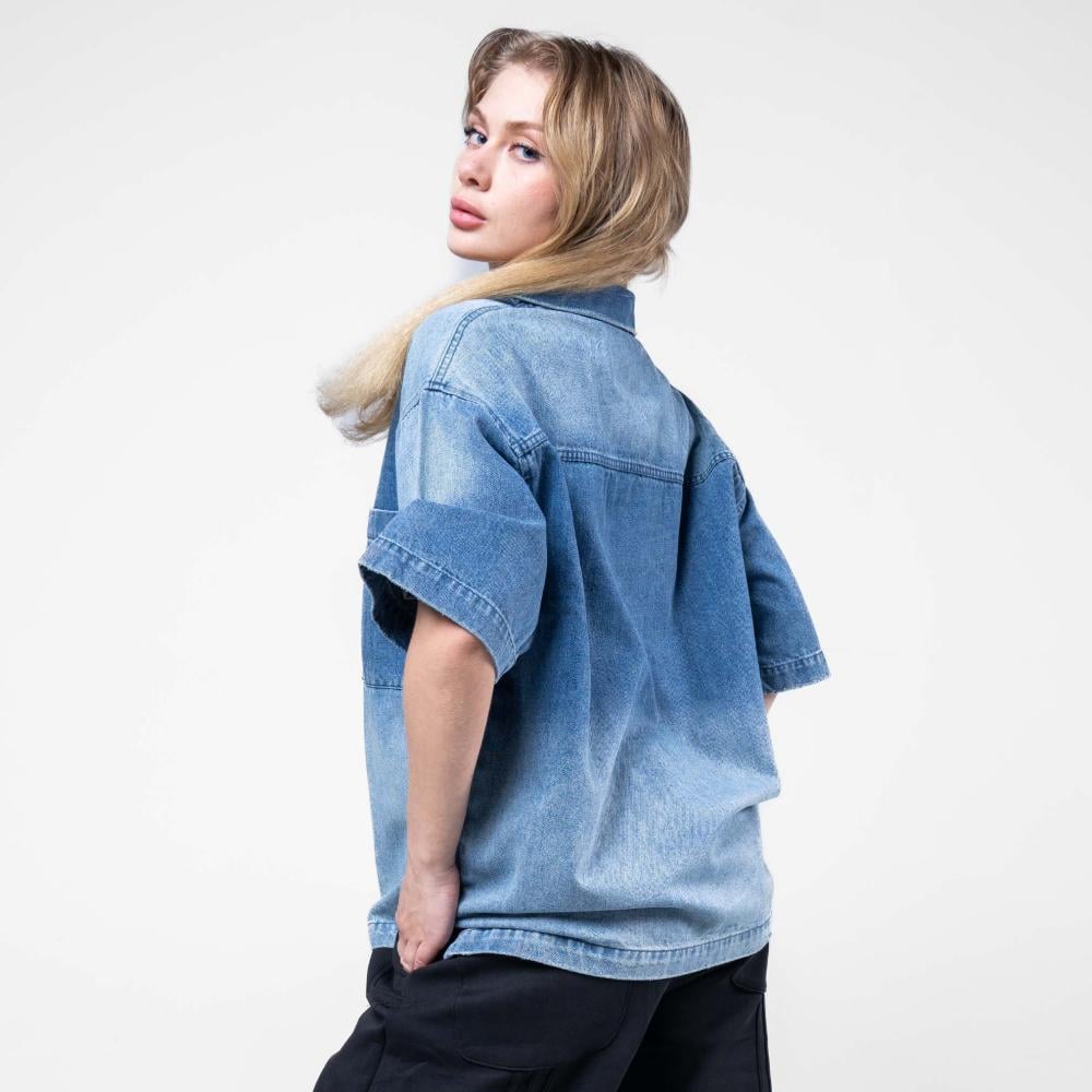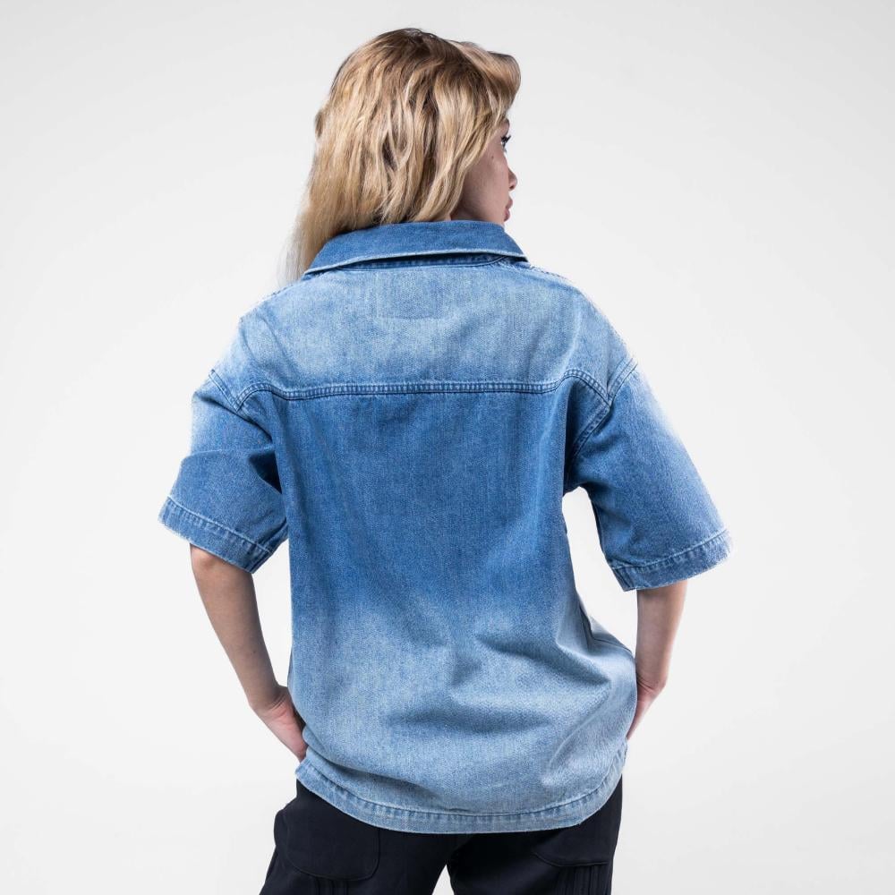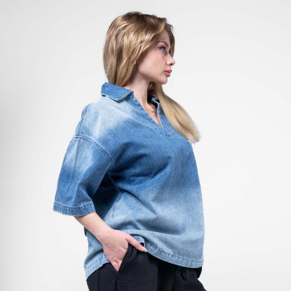 قميص الوان مدرجه وكتابه اماميه بارزة نص كم - أزرق