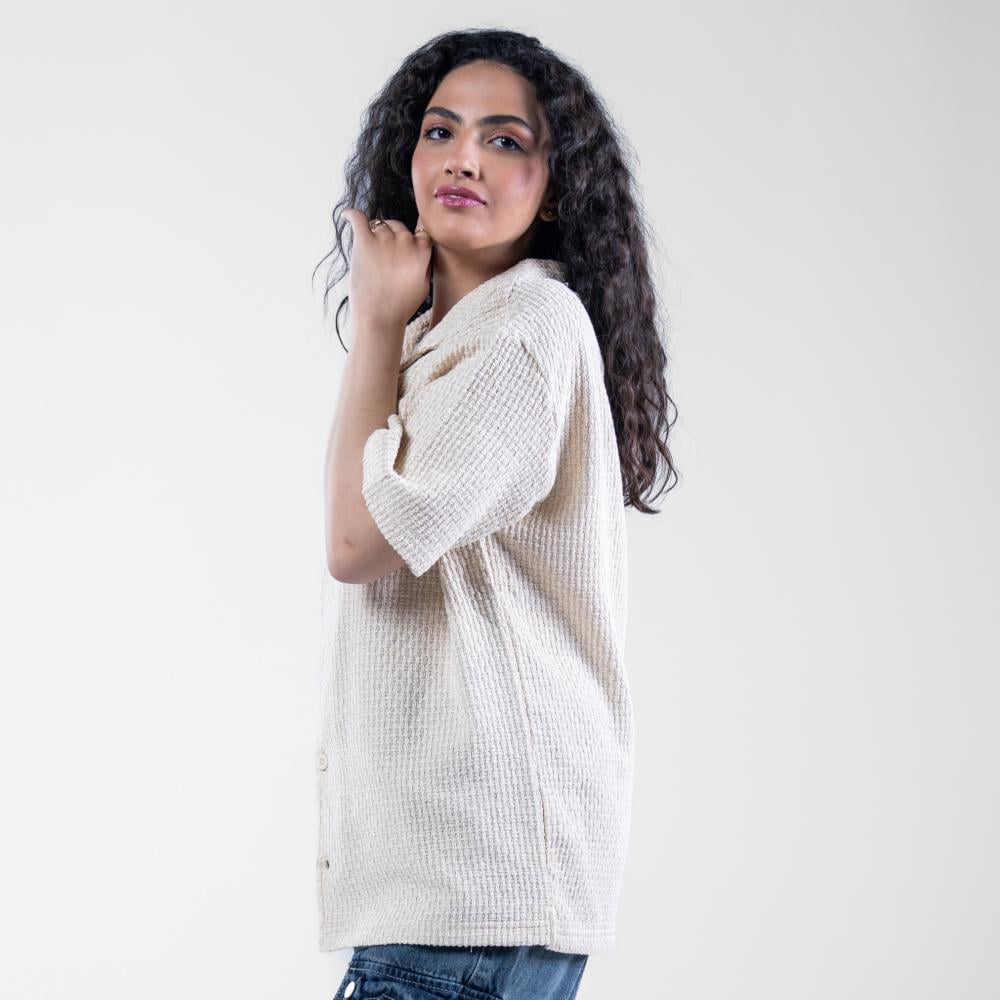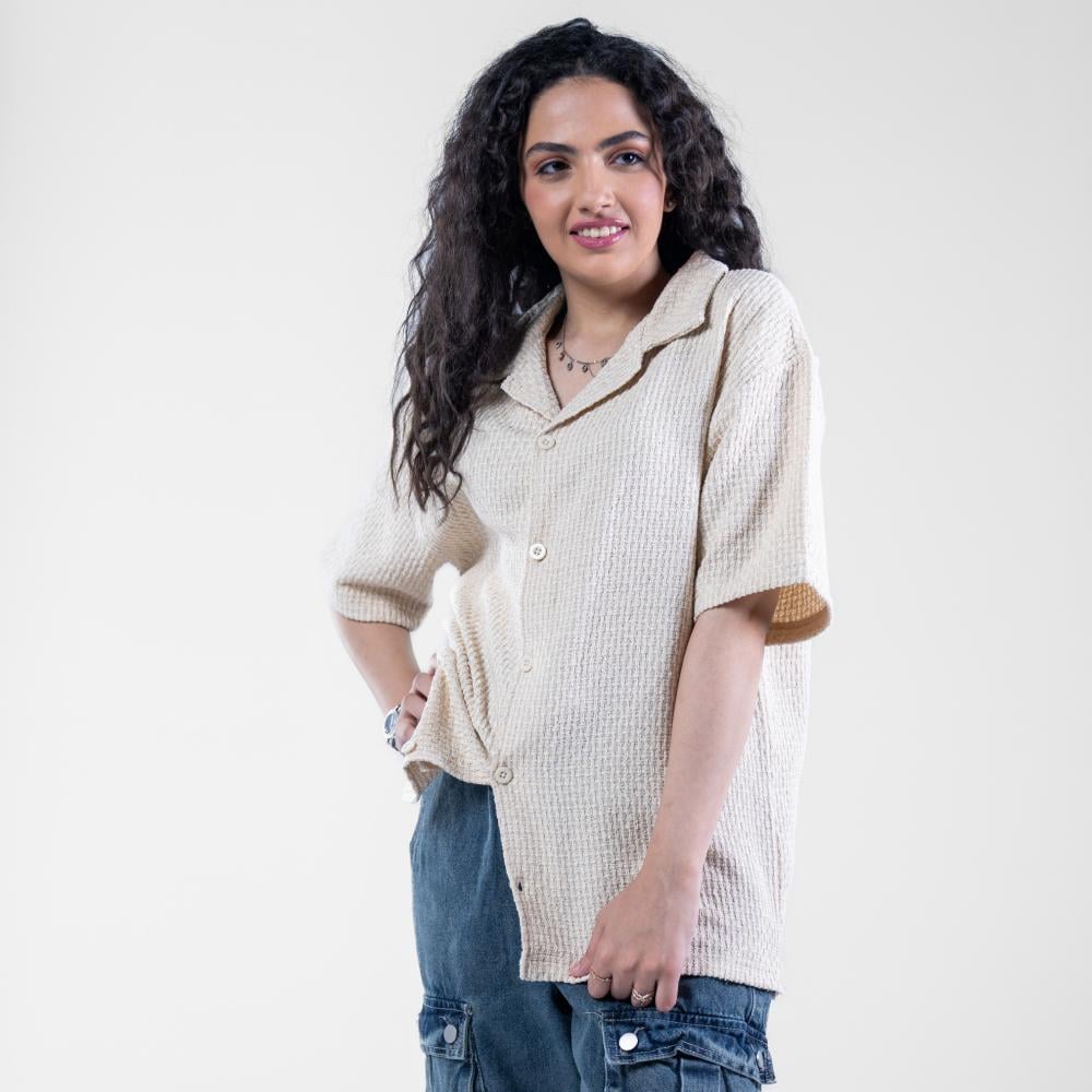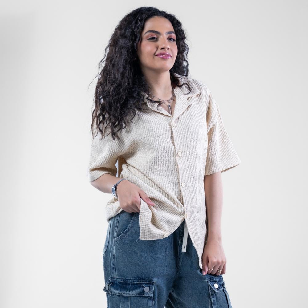 قميص قطن اوفرسايز بنسيج بارز باكمام قصيرة - بيج