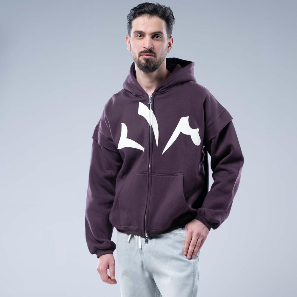 هودي واسع بكاب وطباعة بيضاء حادة - ارجواني